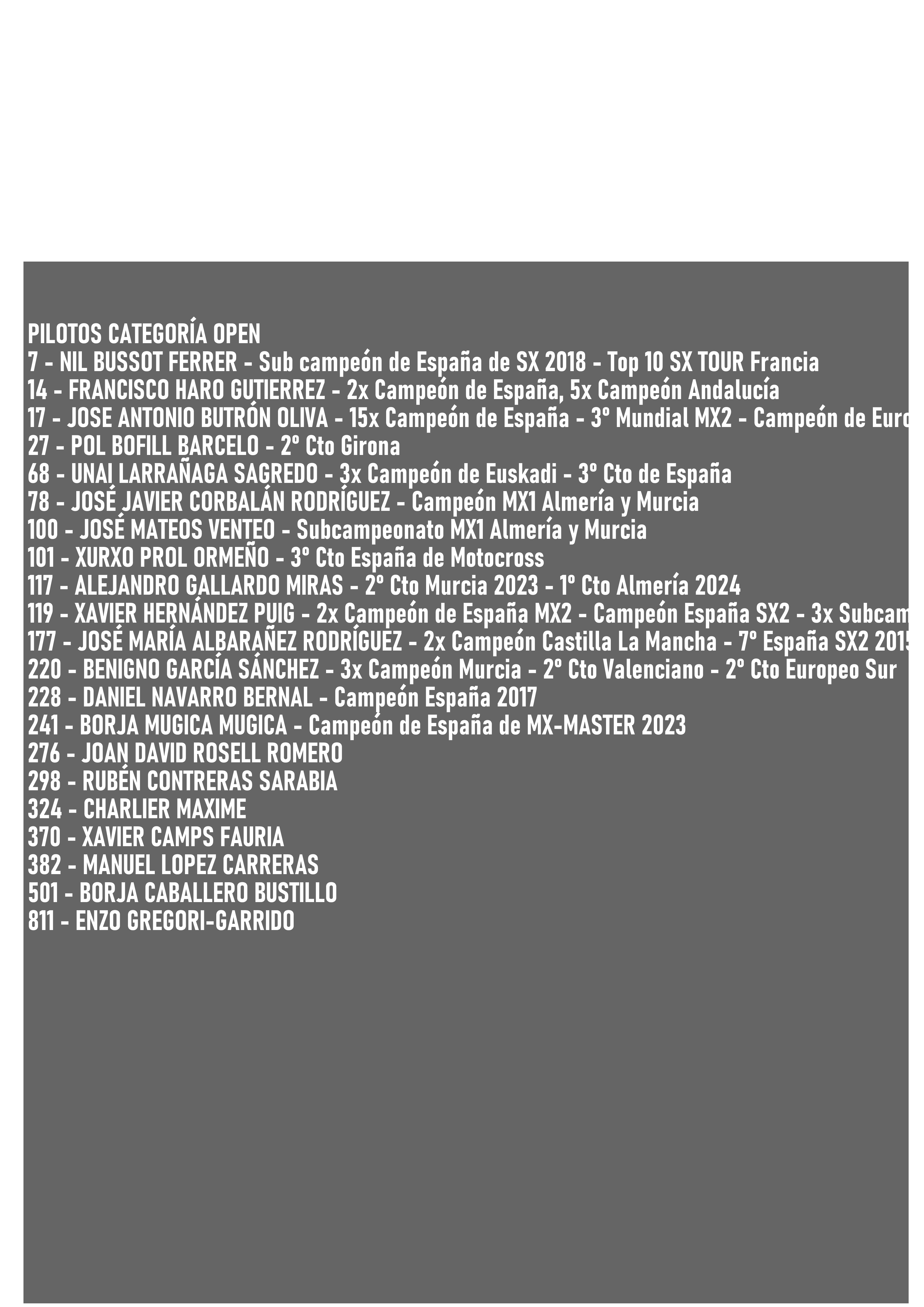 - MX1Onboard: El 13 de agosto de 2024, se informó que Xurxo Prol ganó la Triple Corona, seguido por José Antonio Butrón y Nil Bussot. Además, Butrón se llevó la victoria en el Face to Face. Se resaltó la asistencia de cerca de 4,000 personas y la excelente organización del Moto Club Bajo Almanzora.